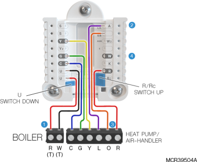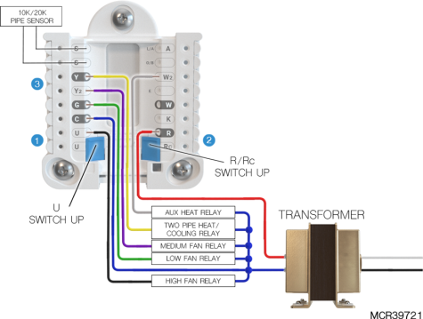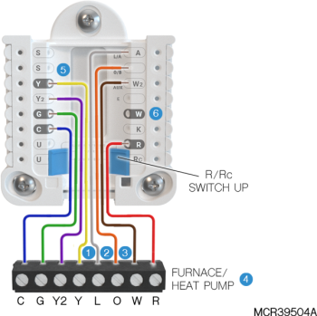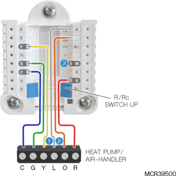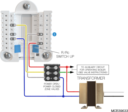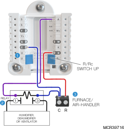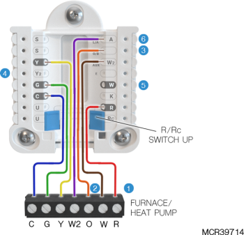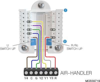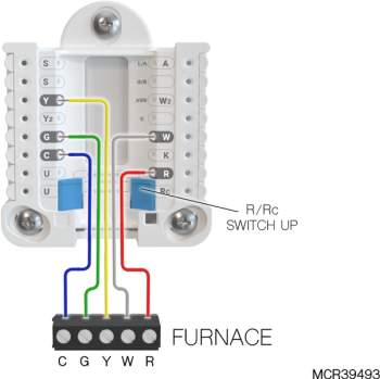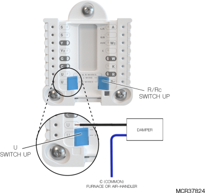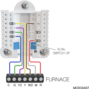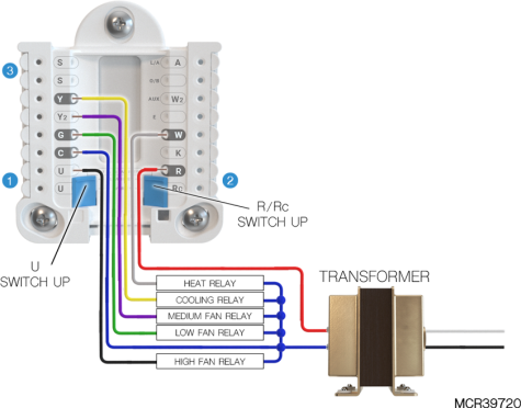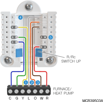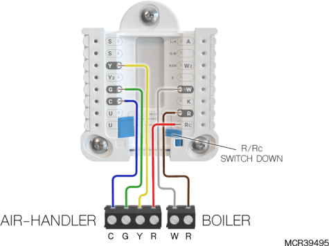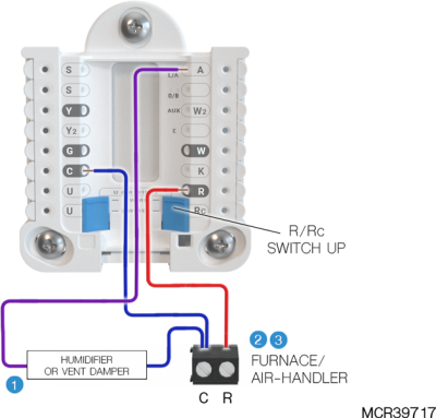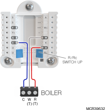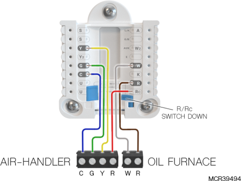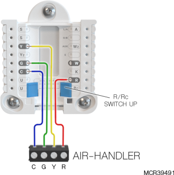 If heating (not shown) uses a different transformer than cooling, cooling transformer goes to Rc and the R/Rc slider should be down. |