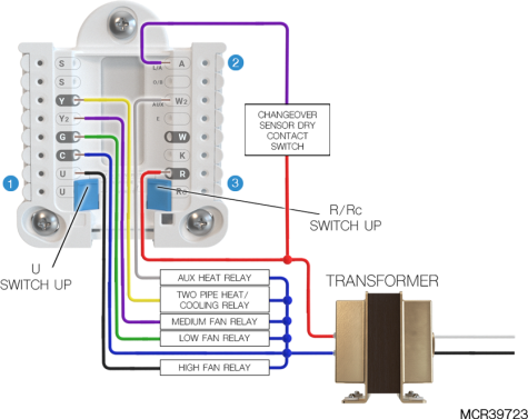 Wire the dry contact changeover switch to R at the fan coil unit and L as shown. ElitePRO™ Series Thermostats can be configured for the changeover switch to be normally open in cool or heat mode. See ISU settings 2054 & 2055. |