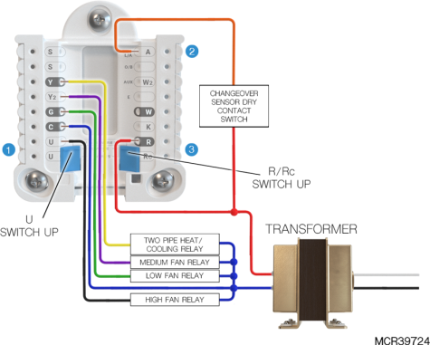 Typical wiring of 2-pipe fan coil without reheat using dry contact switch for Heat/Cool changeover