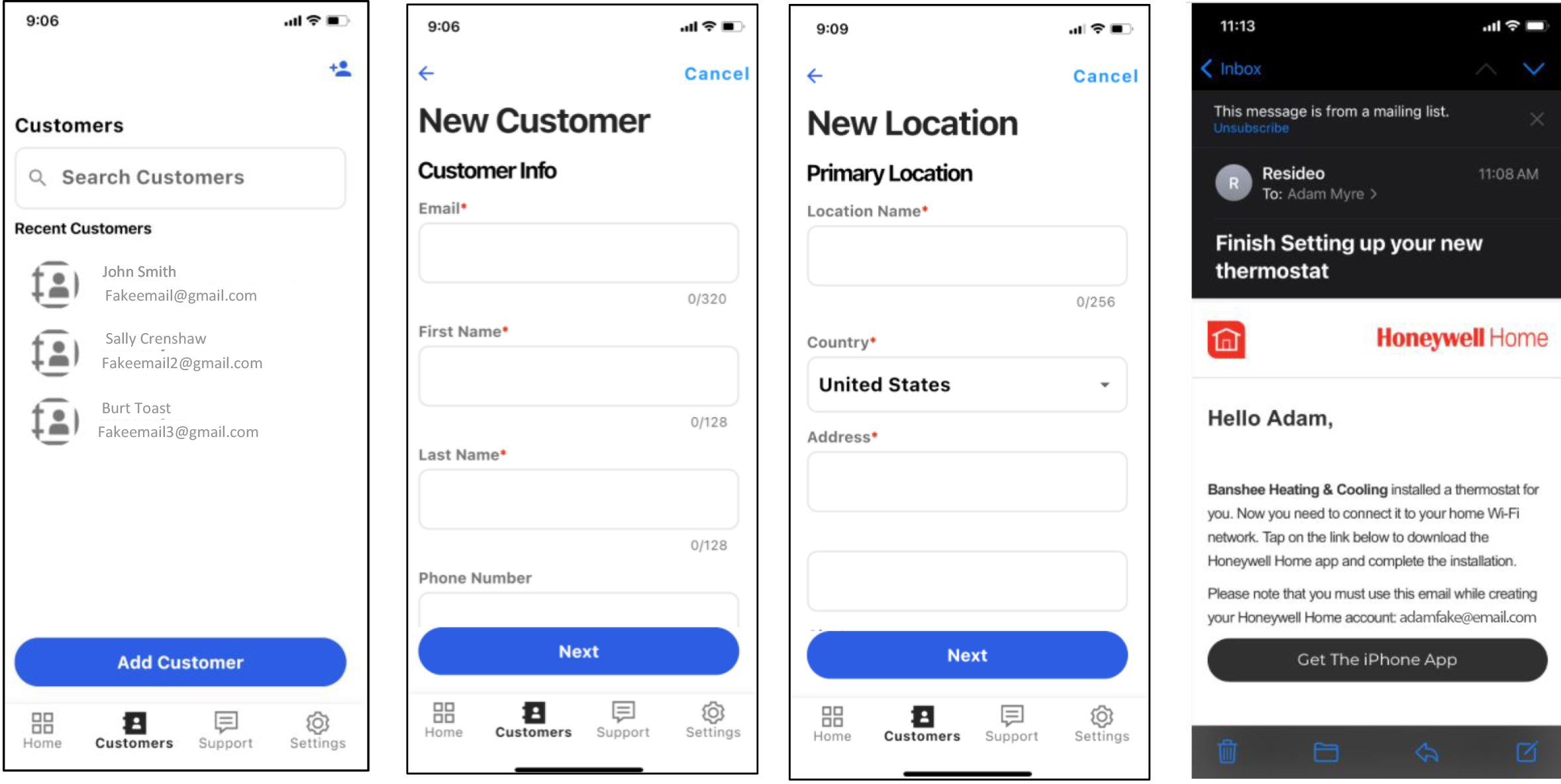 Once you have finished adding the customer information below, the app will send an email to the customer inviting them to download the app if they don’t already have the app or to connect the thermostat to WiFi if they already have the app and the thermostat wasn’t added to WiFi by the installer.