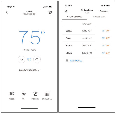 Time-based scheduling: You can program a schedule where every day is different, a schedule where weekdays and weekends are different, or a schedule where every day is the same. There are four adjustable periods per day: Wake, Away, Home, and Sleep.